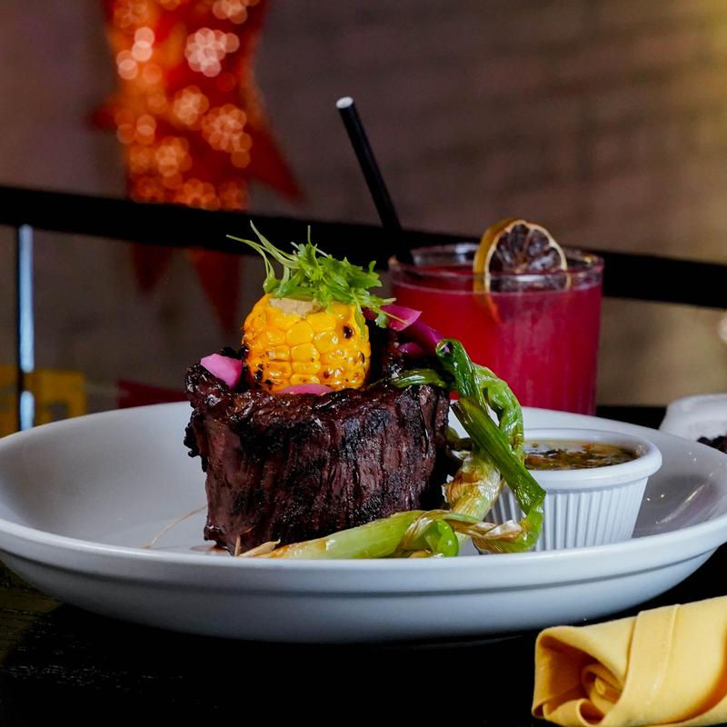 Prime skirt steak 14 oz - grilled corn, rice, cowboy beans - chorizo & onions, cilantro, chimichurri.