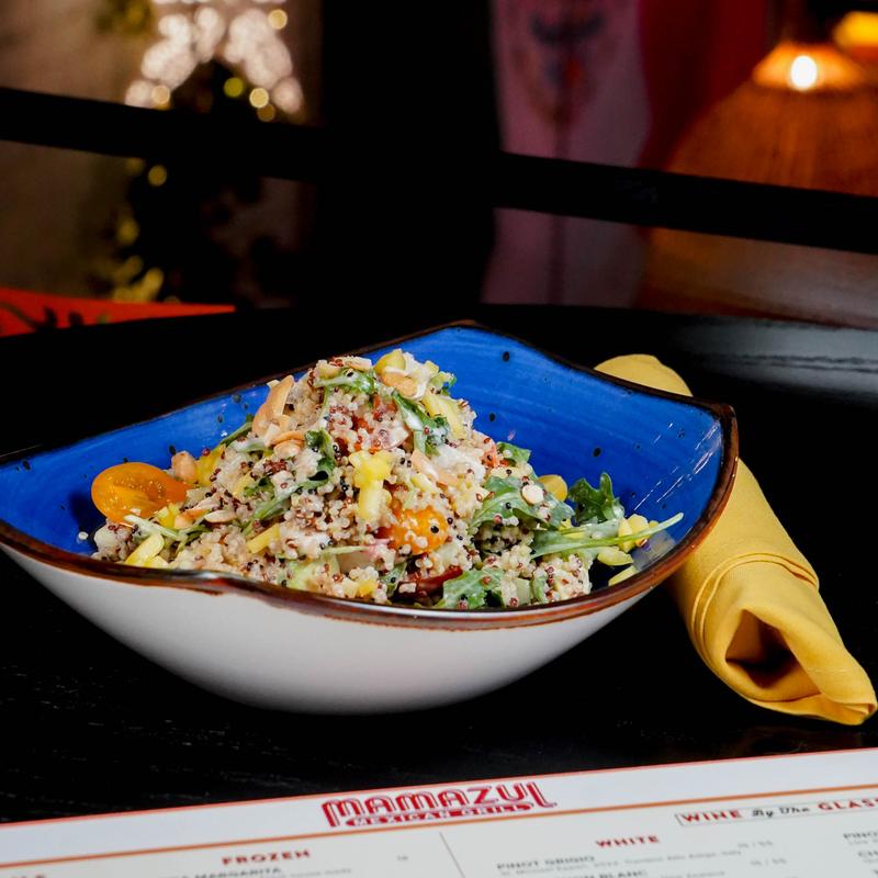 Tri-color quinoa, jicama, avocado, mango, cucumbers, tomatoes, toasted cashews, and cashew dressing.